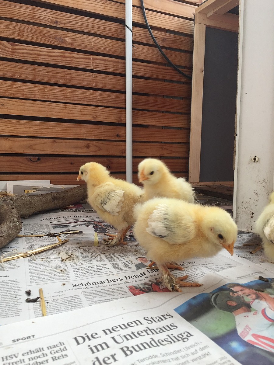14 Tage lang haben wir "Kükenkino" vom Wohnzimmerfenster aus. Wir fütterten die Kleinen regelmäßig mit der Hand und lassen sie über unsere Hände laufen. Doch nach kurzer Zeit müssen die Küken mitsamt der Wärmelampe nach draußen in eine Holzkiste mit Auslauf. Denn ganz schnell wird deutlich: die Küken fangen schon nach kürzester Zeit an zu scharren und wollen ihr Futter aus der Erde suchen und brauchen mehr Platz - alles instinktiv, ohne das ein Muttertier es ihnen vorgemacht hat! Und so können sie noch eine Zeit lang bei uns im Garten bleiben, wo wir sie mind. 2x pro Tag versorgen, bis die Geflügelpest einen komplett überdachten Stall fordert.