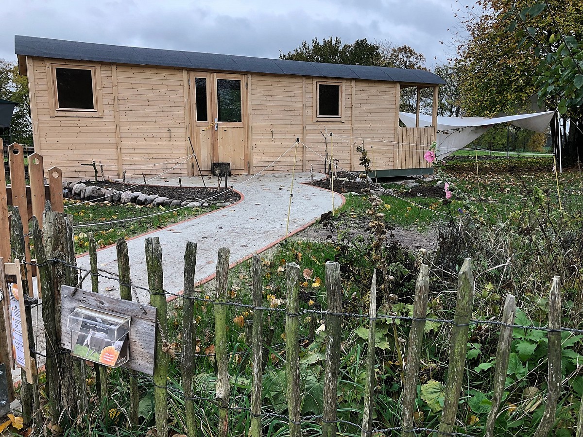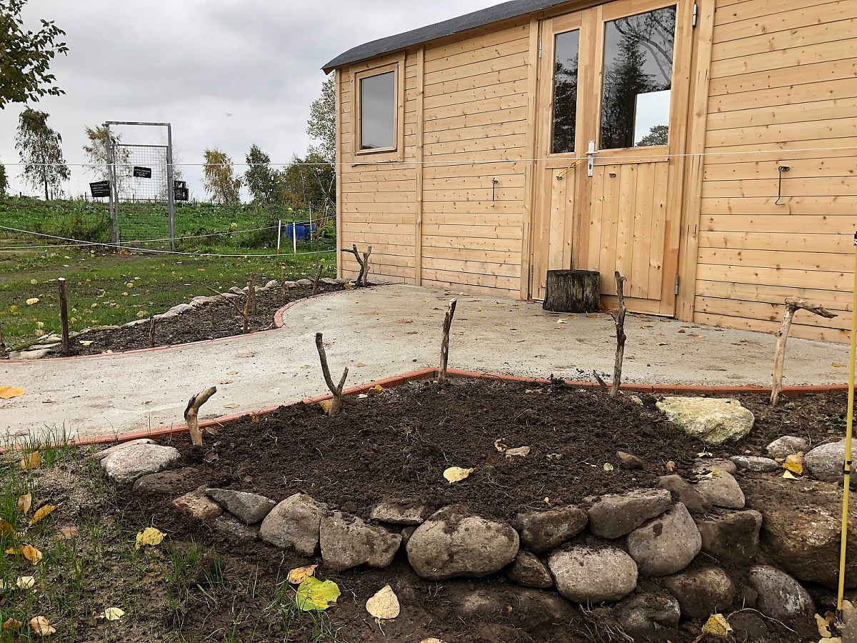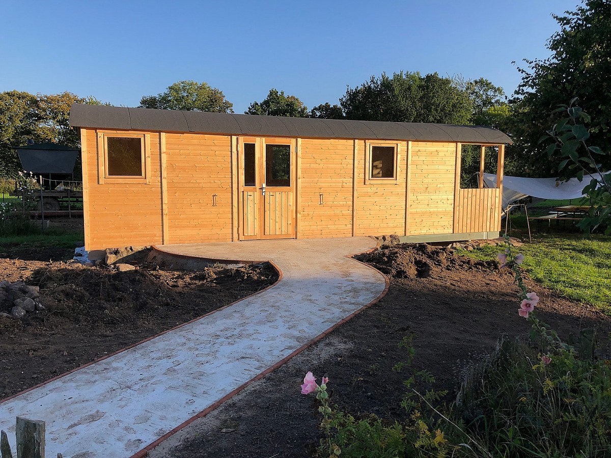 Der Wagen kam im Bausatz: Es wurde eine gedämmte Bodenplatte erstellt, Wände aufgestellt, ein Dach gedeckt, etliche Kubickmeter Beton zu Weg und Parkplatz verarbeitet und die Komposttoilette aufgebaut. 1000 Dank an das gesamte Team des Gutes!!! Nun ist es an mir in der Winterpause eine praktische, kuschelige Inneneinrichtung zu schaffen :)