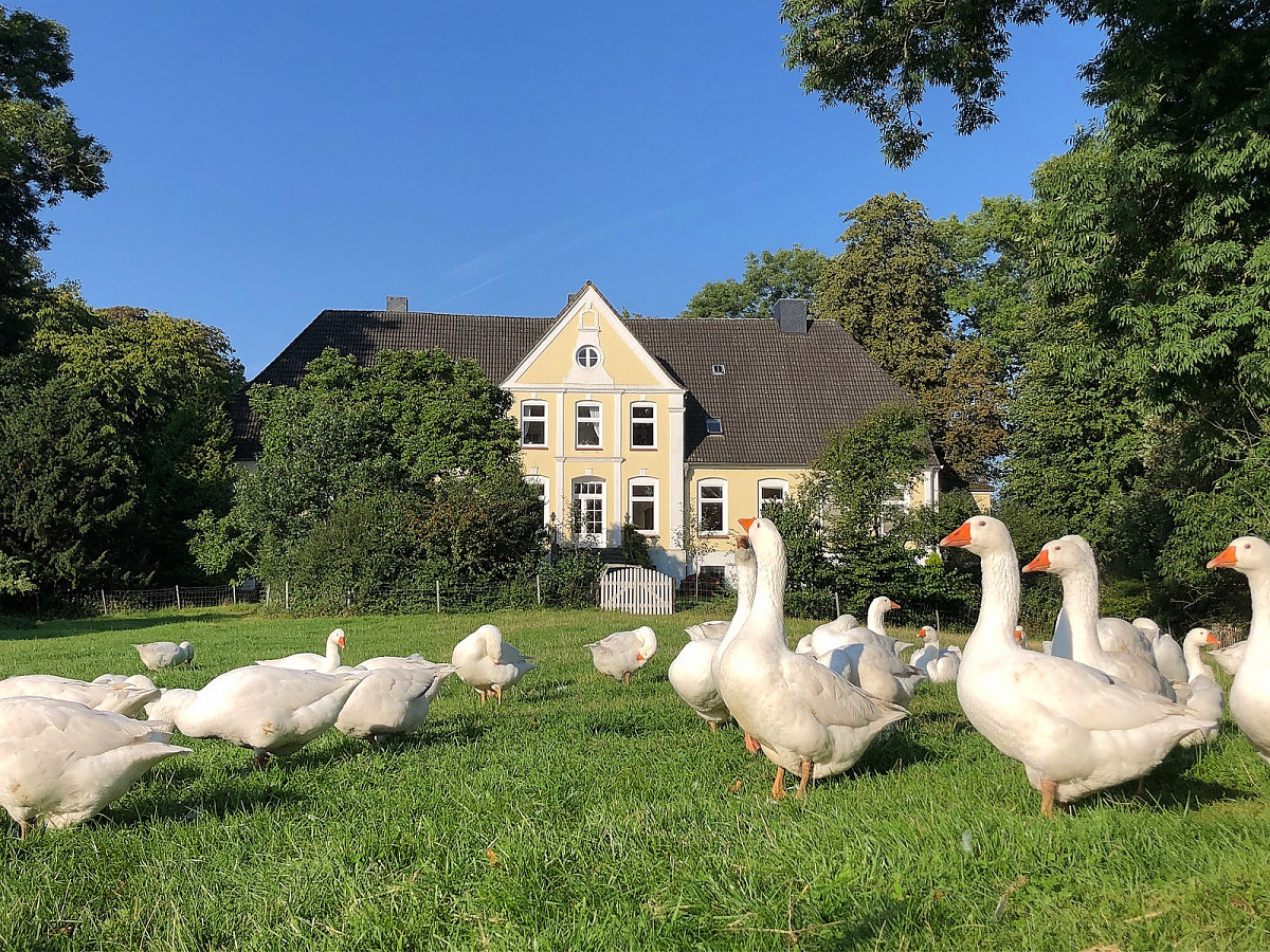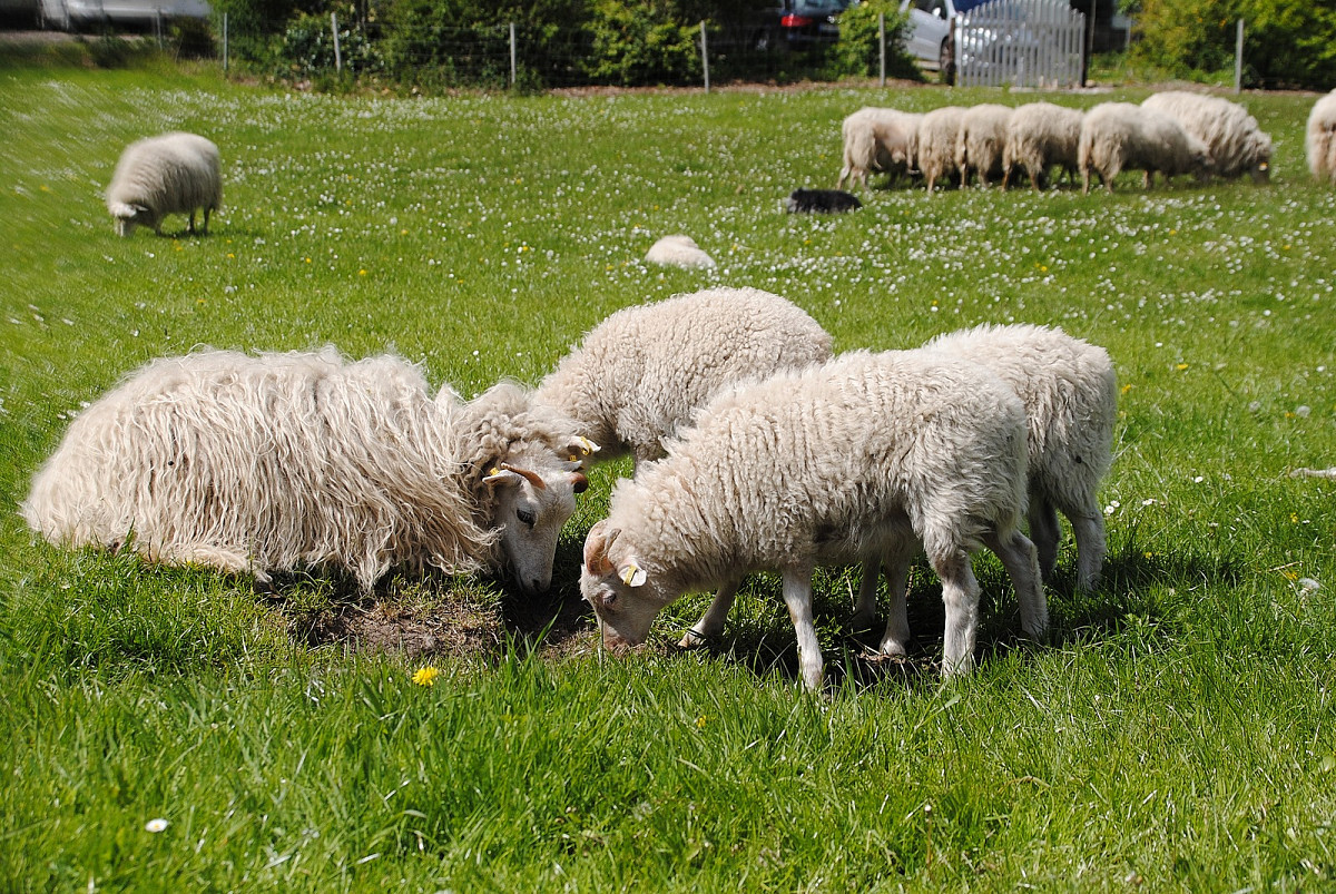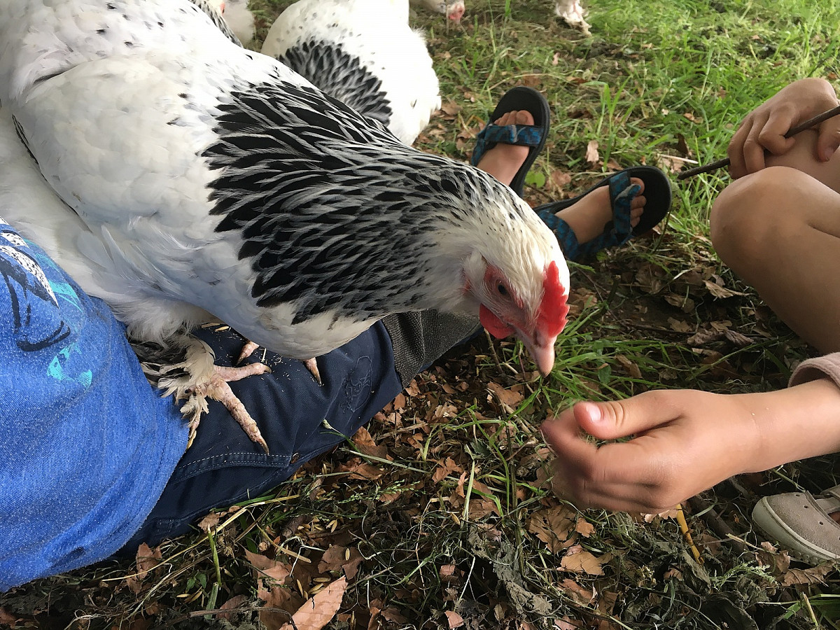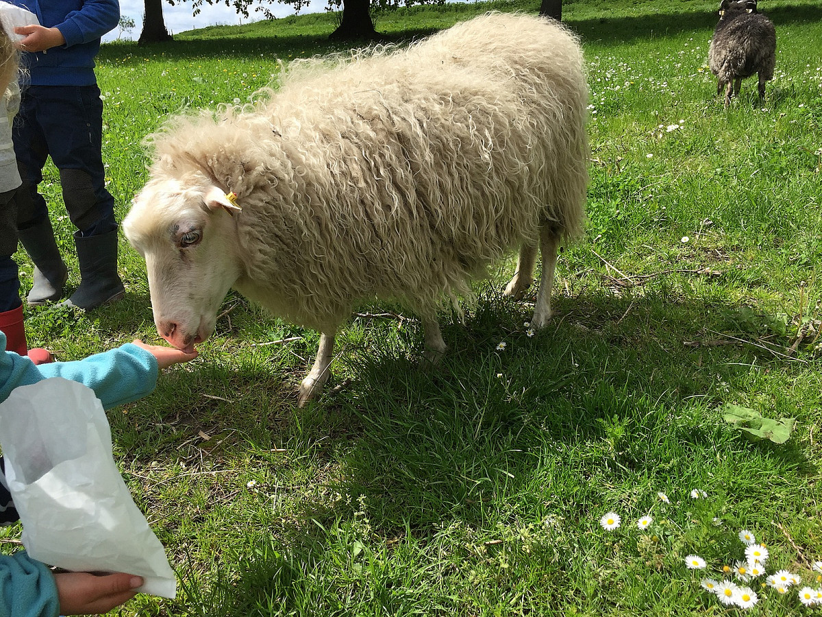 Wir füttern die Sudden und Hühner und erfahren in der kindgerchten Führung viel Wissenswertes über die Schweine, Schafe, Gänse und Hühner des Hofes.